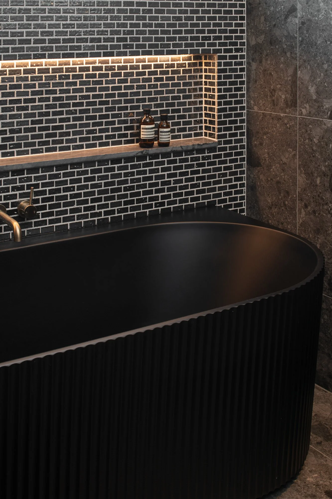 The wet rooms were finished with a large scale terrazzo look tile, a selection of Japanese mosaic feature tiles; which added a beautiful tactility and Faucet Strommen tap ware in Discovery Bronze finish.