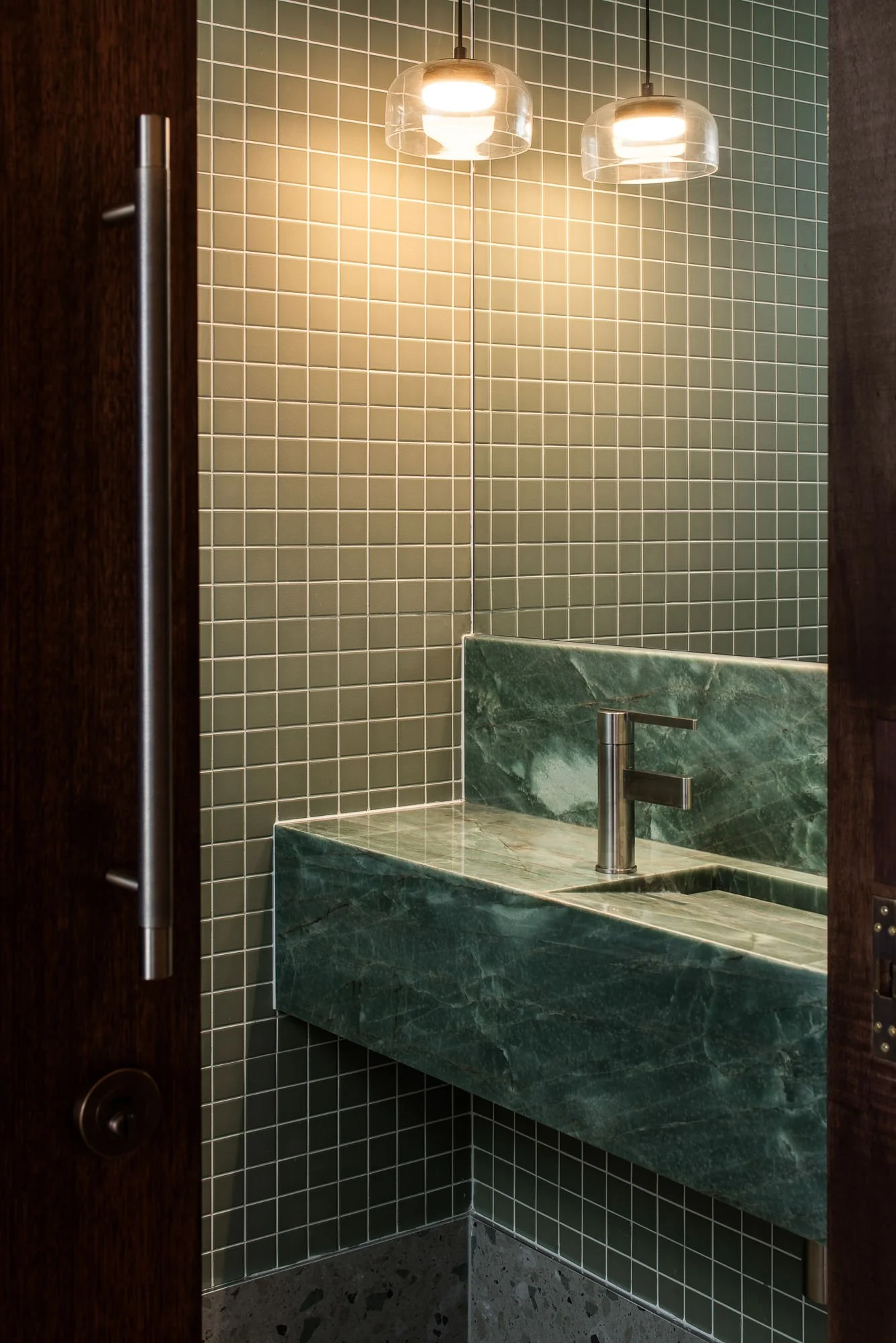 Refraining from the typical dental clinic aesthetic that can at times feel quite clinical and commercial, the intention was to create a warm and inviting space for the DDTA patients. Walnut timber, antique brass, smoked mirror and ‘Smereldo’ emerald green Quartzite adorn the reception and waiting rooms, while the surgeries consist of Walnut timber, Corian Dune Prima work tops, Dulux ‘Vintage Green’ joinery & reeded glass.