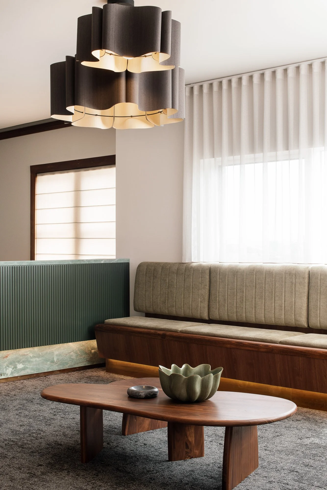The second building within DDTA houses the skin and wellness clinic, which saw a more feminine approach to its aesthetics. Warm toned joinery is adorned with brass hardware and Calcutta Viola marble, paired with contemporary furniture, Dina Broadhurst artwork and blush velvet upholstered seating.