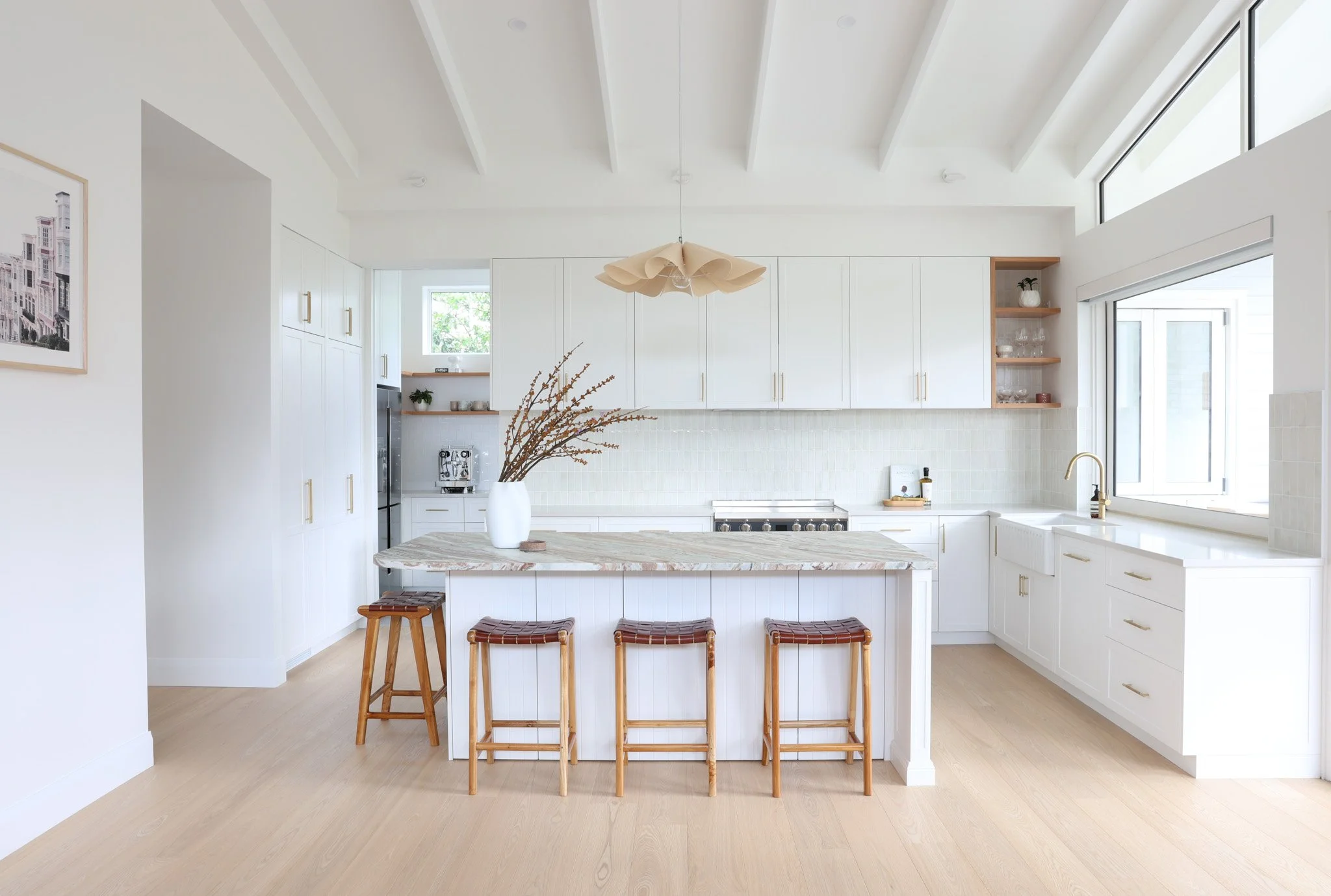 Materiality consisted of European Oak engineered timber floorboards, white shaker and VJ style joinery, stunning Rosa Levante Marble, zelliege tiles and brass fixtures & fittings.