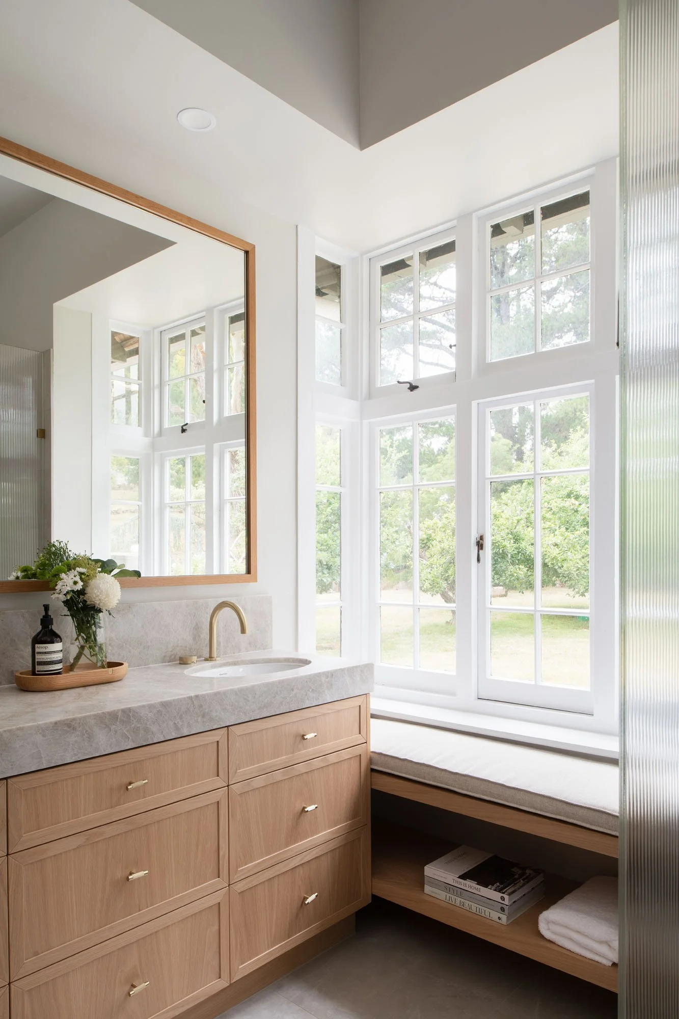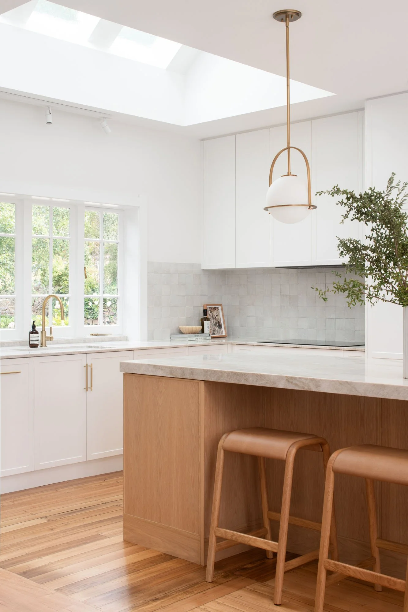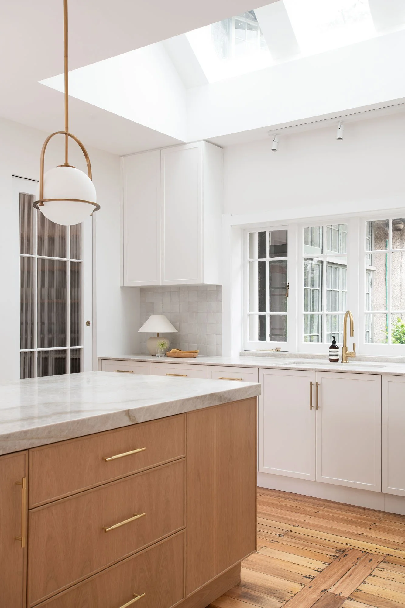 A new kitchen, walk in pantry and laundry were re-designed with added functionality and storage aswell as an improved open plan layout. The main bathroom, ensuite and powder room was also revitalised with cohesive materials that brought warmth and texture. Distinctive natural stone, shaker style joinery, zellige tiles and brushed brass fittings formed the palette for these timeless neutral interiors.